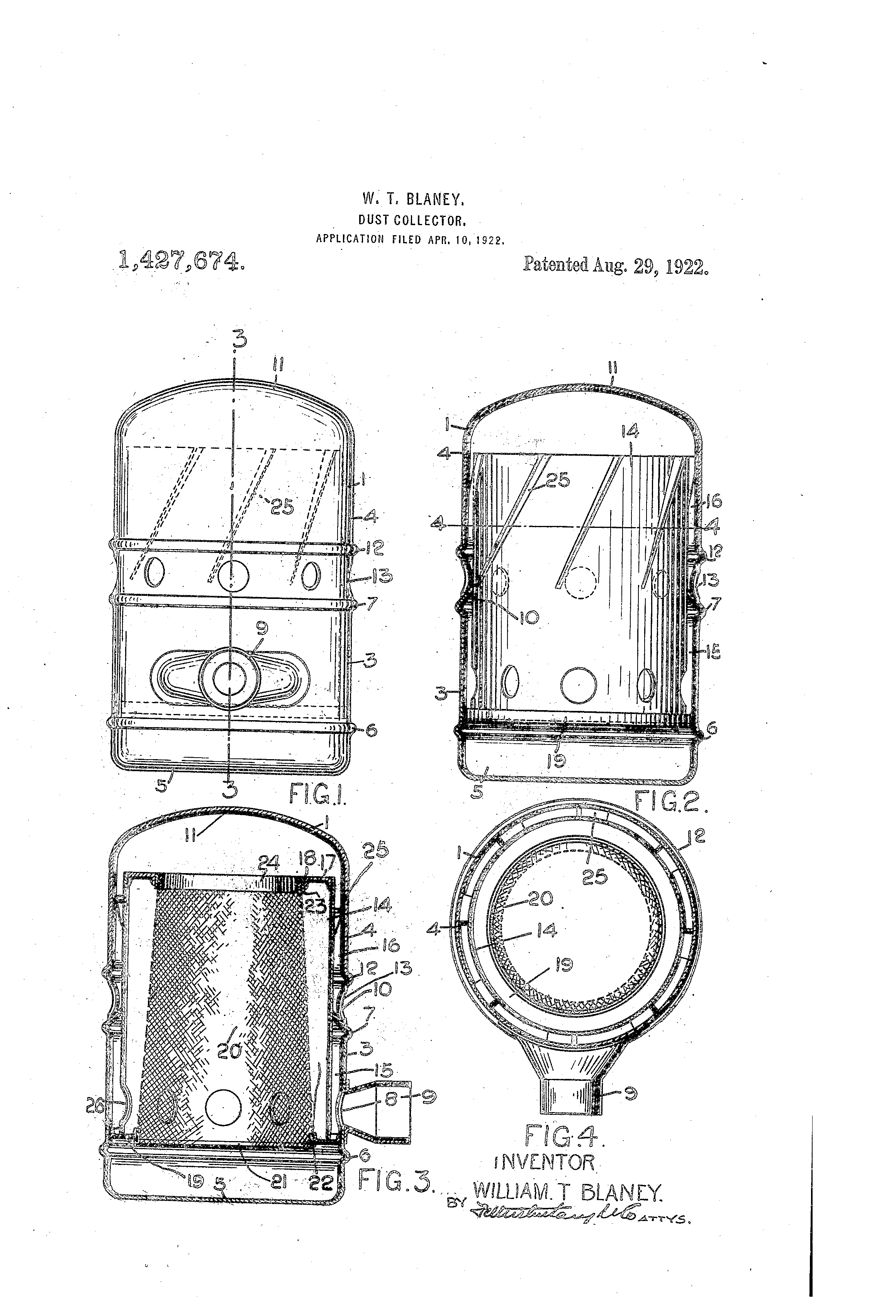 William Thomson Blaney inventa l'aspirapolvere. Applicazione depositata il 10 aprile 1922 .